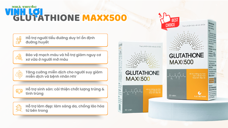 Do đó, việc bổ sung Glutathione hàm lượng cao – Glutathione MAXX500 trở nên cần thiết để bù đắp lượng Glutathione suy giảm. Bổ sung Glutathione đường uống được ghi nhận có thể góp phần cải thiện chỉ số chuyển hóa, từ đó hỗ trợ ổn định đường huyết ở người tiểu đường một cách bền vững.